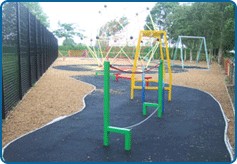 1This area is suitable for children aged 0-12 years. Equipment includes swings, parrot see saw, spring rocker, Odyssey tower, roundabout and rope net climbing structure. Safety surfacing in a variety of colours and shapes is installed over the complete area of the playground.